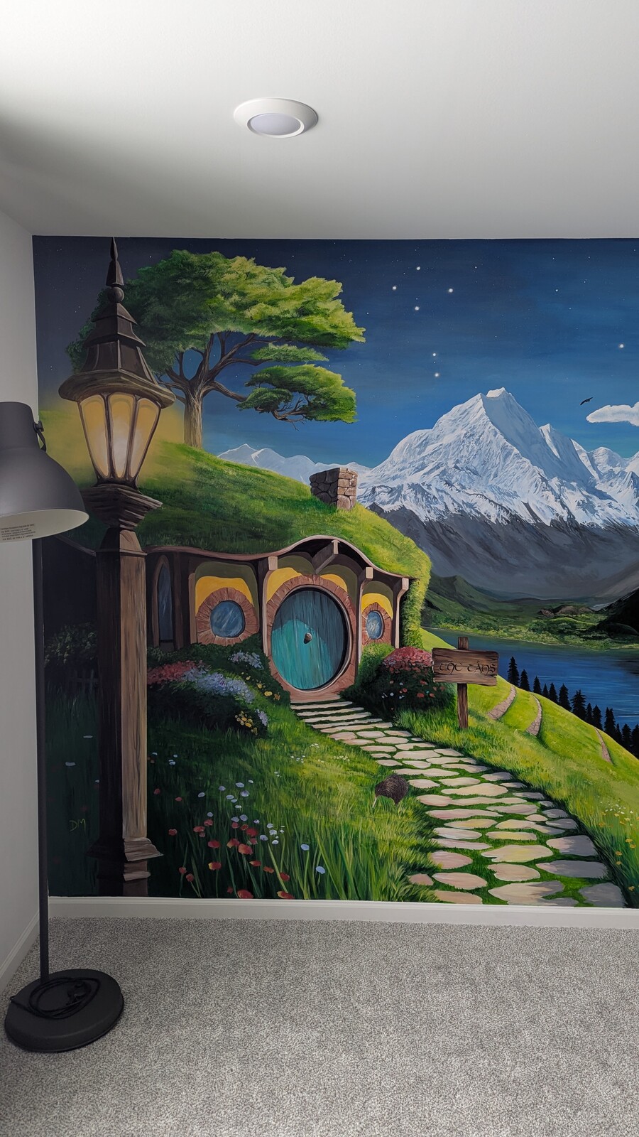 A mural for a home office inspired by a trip to New Zealand. Complete with a Hobbiton home, Mt. Cook, and even a cloud shaped like New Zealand! (plus other fun nods to the country!)
