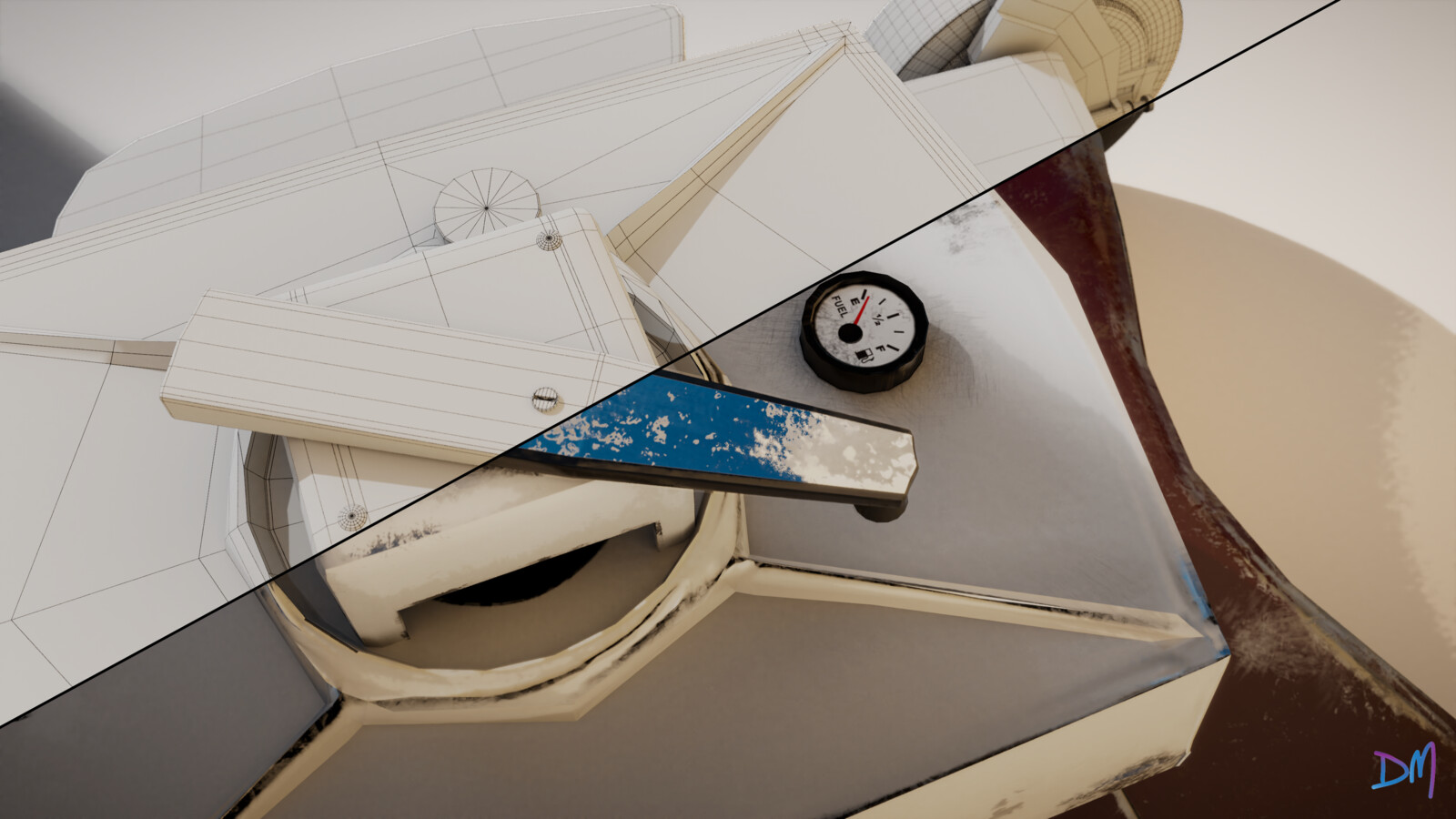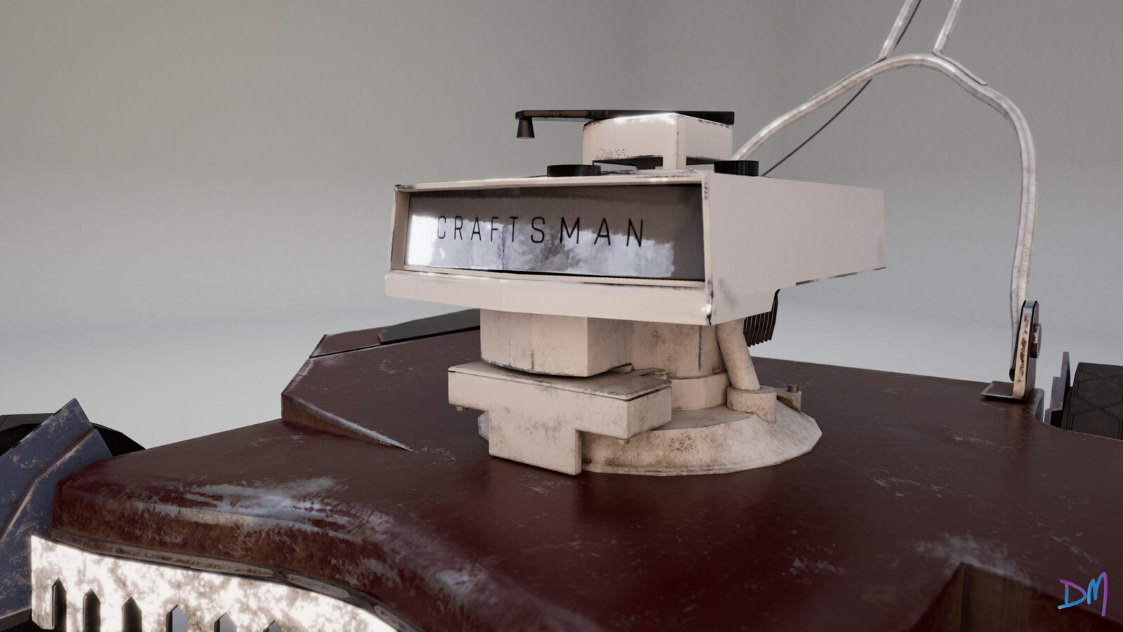 This is a union of two projects I worked on: Modeling and lighting scenarios. First, a 3D prop model of a vintage craftsman lawn mower (model 131.91280) that I worked on for a Modeling course. I decided to make the body of the mower a classic red hue, despite the reference I found to be more of a blue, middle gray tone.