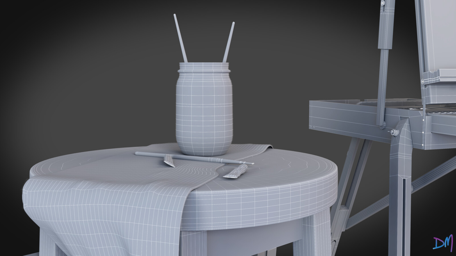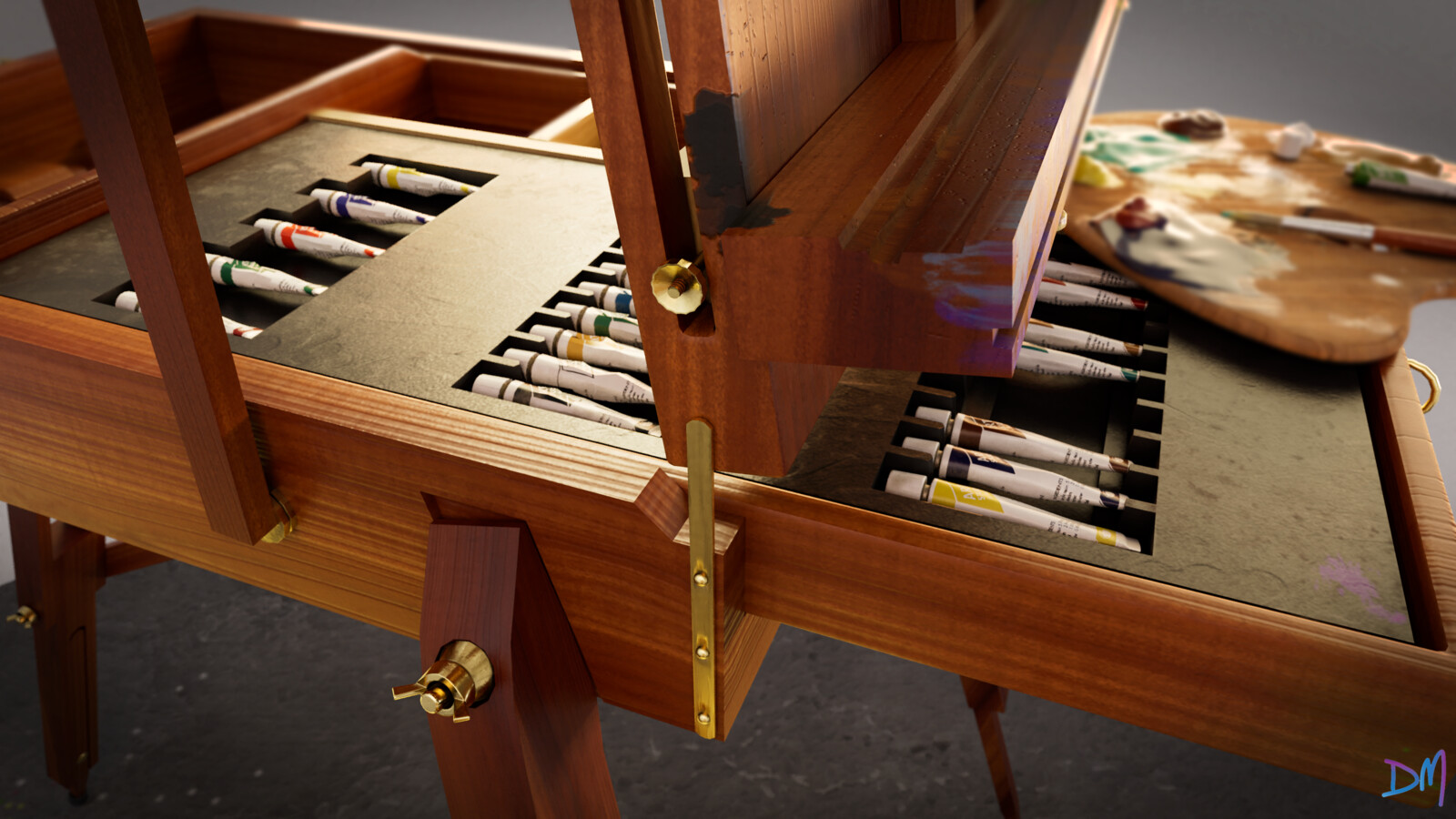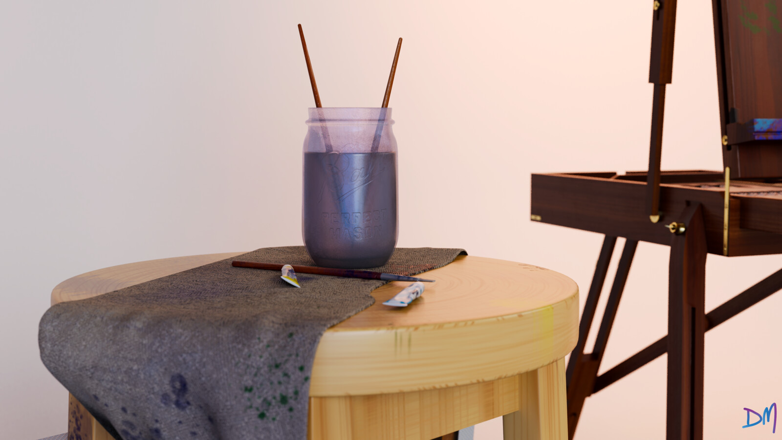 This is my Easel, my paints, and one of the first paintings I did when I was 13 years old. I haven't "graduated to 3D art". I did enjoy modeling this small environment; but I will not stop painting as well.